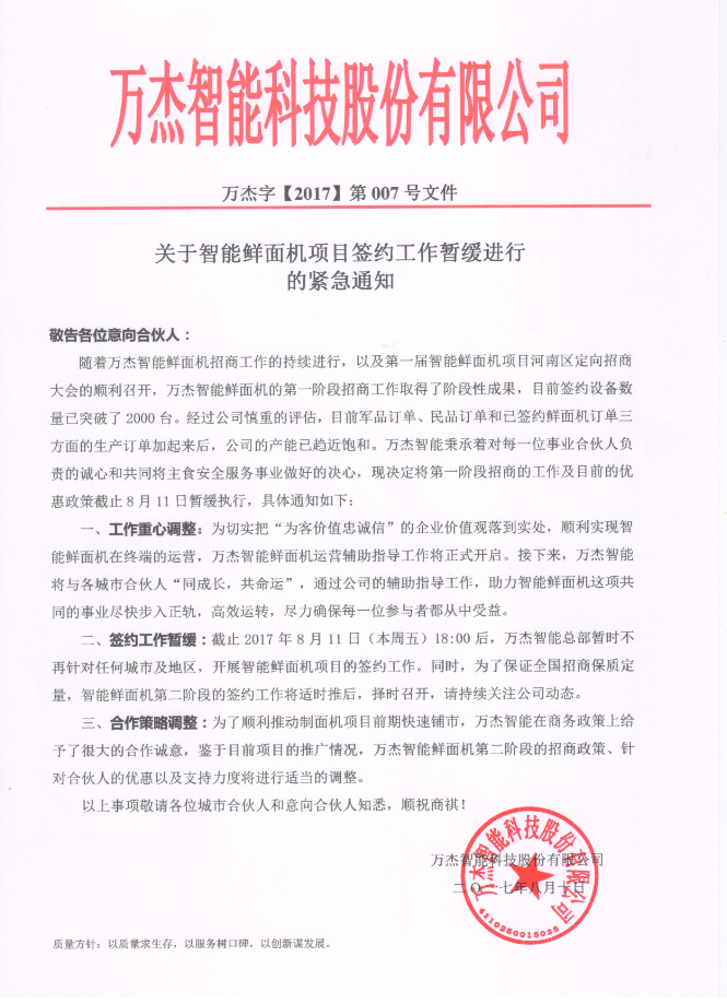 敬告各位意向合伙人: 隨著萬杰智能鮮面機招商工作的持續(xù)進(jìn)行,以及第一屆智能鮮面機項目河南區(qū)定向招商大會的順利召開,萬杰智能鮮面機的第一階段招商工作取得了階段性成果,目前簽約設(shè)備數(shù)量已突破了2000臺。經(jīng)過公司慎重的評估,目前軍品訂單、民品訂單和已簽約鮮面機訂單三方面的生產(chǎn)訂單加起來后,公司的產(chǎn)能已趨近飽和。萬杰智能秉承著對每一位事業(yè)合伙人負(fù)責(zé)的誠心和共同將主食安全服務(wù)事業(yè)做好的決心,現(xiàn)決定將第一階段招商的工作及目前的優(yōu)惠政策截止8月11日暫緩執(zhí)行,具體通知如下: 一、工作重心調(diào)整:為切實把“為客價值忠誠信”的企業(yè)價值觀落到實處,順利實現(xiàn)智能鮮面機在終端的運營,萬杰智能鮮面機運營輔助指導(dǎo)工作將正式開啟。接下來,萬杰智能將與各城市合伙人“同成長,共命運”,通過公司的輔助指導(dǎo)工作,助力智能鮮面機這項共同的事業(yè)盡快步入正軌,高效運轉(zhuǎn),盡力確保每一位參與者都從中受益。 二、簽約工作暫緩:截止2017年8月11日(本周五)18:00后,萬杰智能總部暫時不再針對任何城市及地區(qū),開展智能鮮面機項目的簽約工作。同時,為了保證全國招商保質(zhì)定量,智能鮮面機第二階段的簽約工作將適時推后,擇時召開,請持續(xù)關(guān)注公司動態(tài)。 三、合作策略調(diào)整:為了順利推動制面機項目前期快速鋪市,萬杰智能在商務(wù)政策上給予了很大的合作誠意,鑒于目前項目的推廣情況,萬杰智能鮮面機第二階段的招商政策、針對合伙人的優(yōu)惠以及支持力度將進(jìn)行適當(dāng)?shù)恼{(diào)整。 以上事項敬請各位城市合伙人和意向合伙人知悉,順祝商祺!