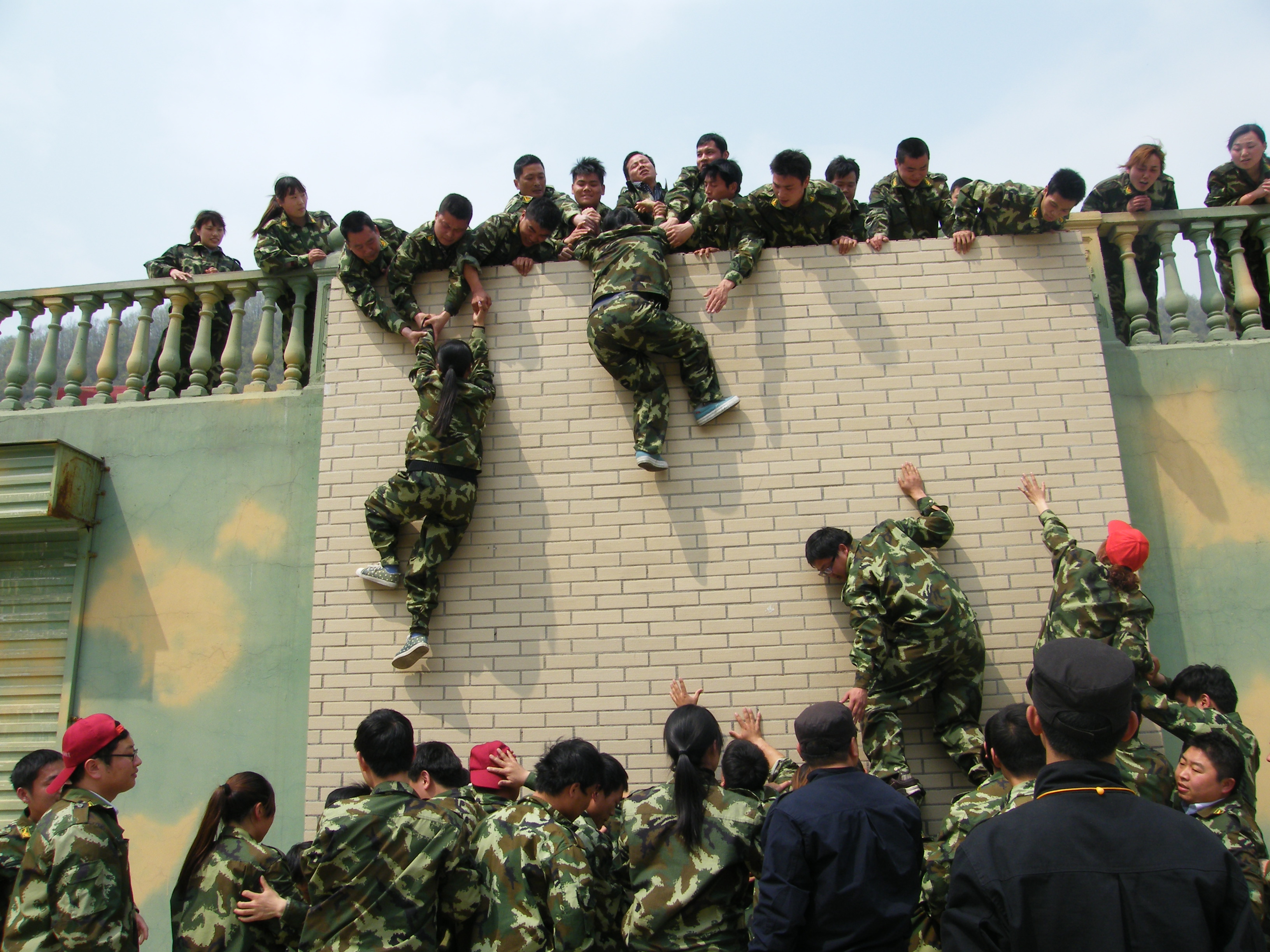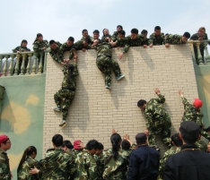 畢業(yè)墻:每個(gè)人都要翻越一堵大約4米且垂直的圍墻,這又是一個(gè)必須依靠集體的力量才能完成的項(xiàng)目。剛開始,大家都認(rèn)為這是很難完成而且比較危險(xiǎn)的任務(wù),估計(jì)需要半個(gè)小時(shí),甚至一個(gè)小時(shí)才能全部通過。 通過集思廣益,我們擬定了計(jì)劃,采用“疊人墻”的方法,讓身強(qiáng)力壯的隊(duì)員作為底座,先由兩三位隊(duì)員踩在他們的肩膀,大家奮力將他們先托上高墻,然后他們在上面接應(yīng),其他同伴踩著底座同伴的肩膀,一個(gè)一個(gè)成功地翻越了高墻。整個(gè)過程歷時(shí)不過5分鐘,活動(dòng)結(jié)束后,所有隊(duì)員都為自己和團(tuán)隊(duì)的精彩表現(xiàn)鼓掌、歡呼,那一刻的場面激動(dòng)人心! 此項(xiàng)目心得體會:首先要感謝作為底座的幾位隊(duì)友,十幾個(gè)同伴踩在他們的肩膀上,汗水、沙土粘滿了衣服,肩膀被踩出紅紅的血痕。他們的奉獻(xiàn)和付出,換來了團(tuán)隊(duì)的成功。無論在工作還是生活中,只有放下自私、愿意付出、為別人著想、才能成就自己,完成目標(biāo)。
