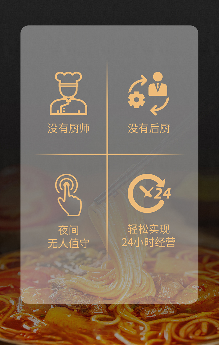 • 可以實現24小時不間斷供應面、水餃、五谷飲品、飲料等;